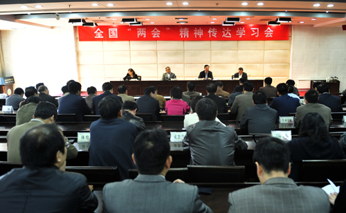 聚集世界目光和全国人民关注的“两会”胜利闭幕,3月22日上午,我校在国际交流中心207会议室召开“两会”精神传达会。全国人大代表、校长孙其信,全国政协委员霍学喜教授、唐明教授分别传达两会精神。校党委书记张光强主持会议。
