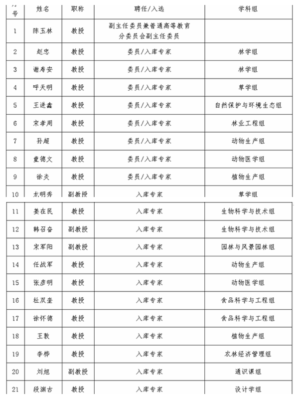 近日,国家林业和草原局成立院校教材建设专家委员会和专家库,我校陈玉林副校长被聘任为专家委员会副主任委员,兼专家委员会普通高等教育分委员会副主任委员,20名专家入选各学科组专家库,其中8名专家推选为各学科组委员。