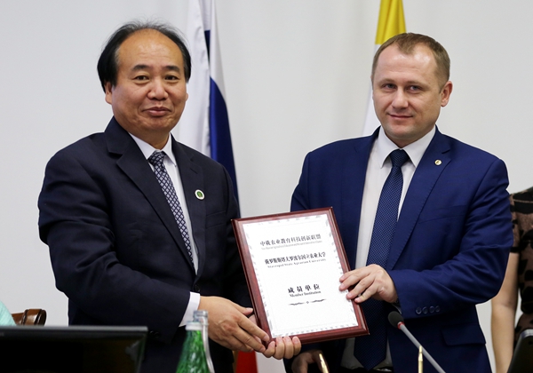 陈玉林与俄罗斯科学院院士、斯塔夫罗波尔国立农业大学校长弗拉基米尔·伊万诺维奇·特鲁哈切夫在开幕式上致辞,并签署合作协议。陈玉林还代表中俄联盟授予斯塔夫罗波尔国立农业大学“中俄农业教育科技创新联盟成员单位”证书,至此中俄联盟己包括中俄两国17家农业科教单位。